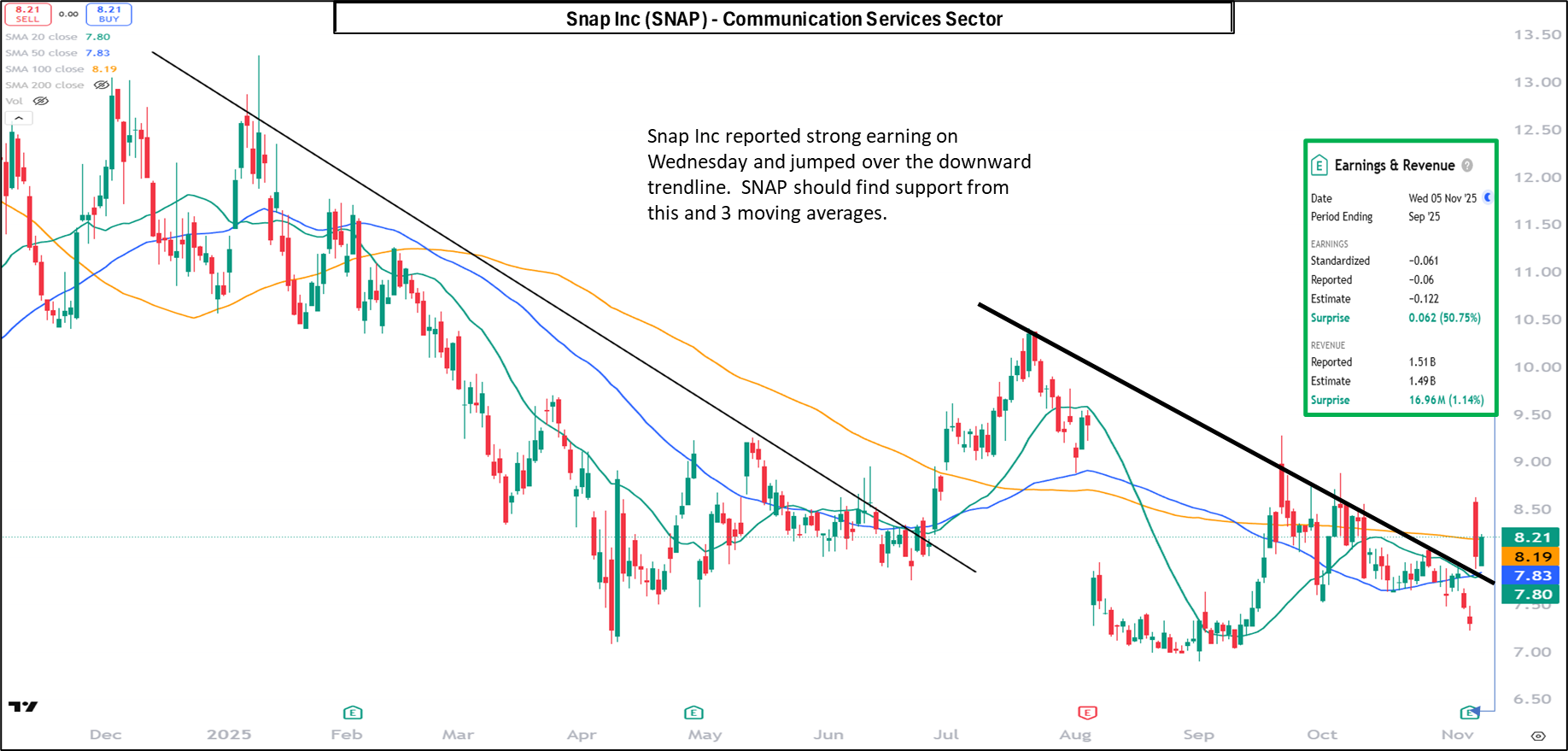 Snap Inc reported strong earning on Wednesday and jumped over the downward trendline. SNAP should find support from this and 3 moving averages.