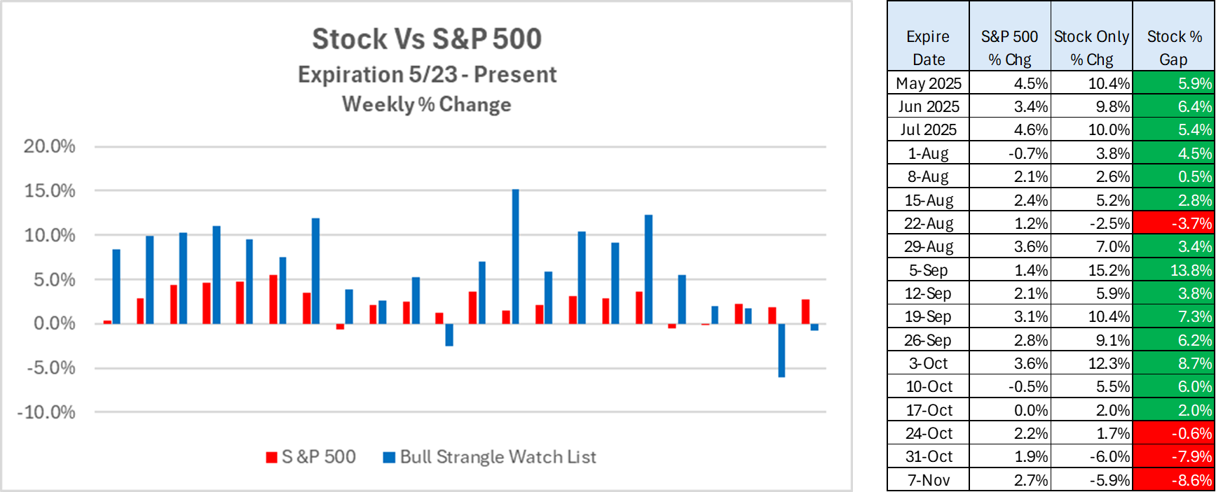 Each week the Newsletter contains around 20 stocks / ETF's on the Watch List to be opened the following Monday for expiration 4 Fridays later. Since the expiration cycle on May 23, the average stock gain on the Watch List has outperformed the S&P 500 20 of 25 weeks. The average Watch List to S&P 500 ratio currently sits at 2.42 : 1 in favor of the Watch List.