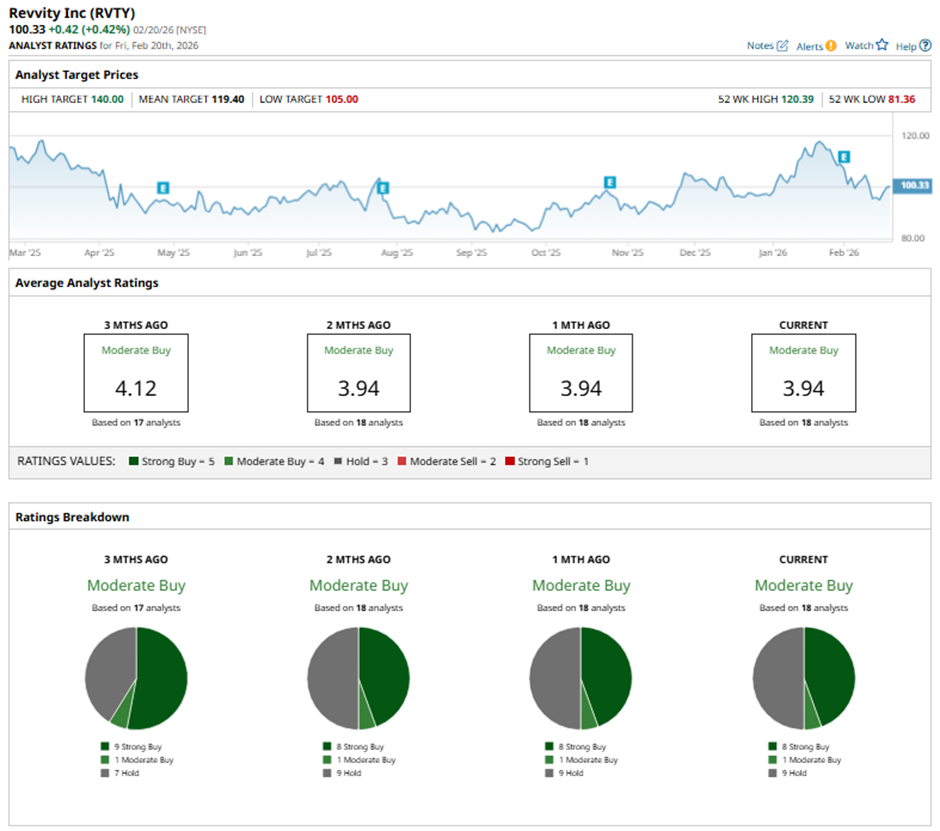 Revvity reported stronger-than-expected Q4 2025 results on Feb. 2, including revenue of $772 million and adjusted EPS of $1.70. Performance was driven by strong Diagnostics growth, with fourth-quarter revenue of $390 million, reflecting 10% reported growth and 7% organic growth. Also, the company initiated upbeat full-year 2026 guidance, forecasting $2.96 billion - $2.99 billion in revenue, 2% - 3% organic growth, and adjusted EPS of $5.35 - $5.45. Nevertheless, the stock fell 1.6% on that day.