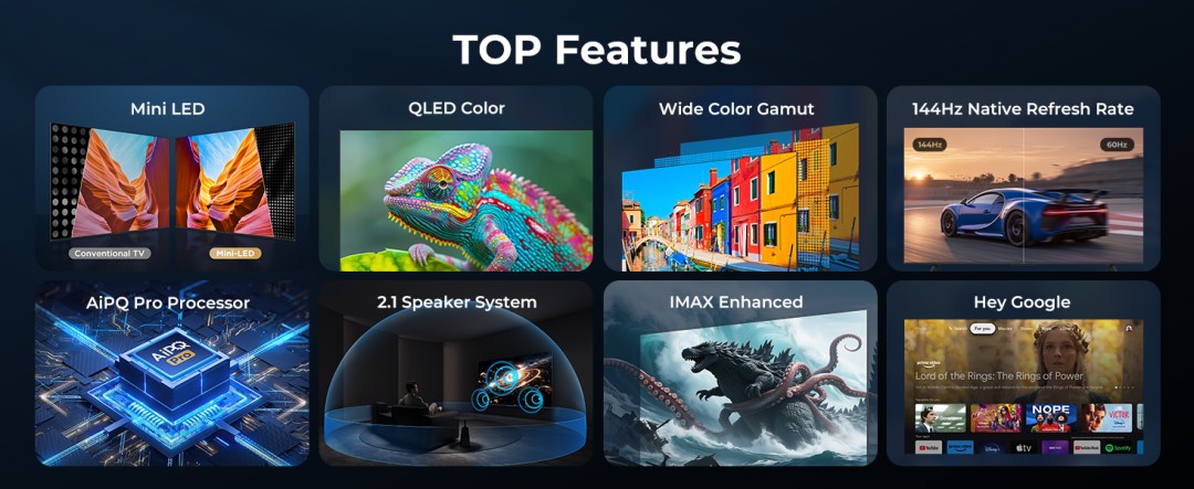 Powered by the AiPQ Pro processor and QLED wide color gamut, this TV delivers up to 93% DCI-P3 coverage for richer layers and sharper details. Dolby Vision IQ automatically adjusts brightness for cinematic visuals, day or night.