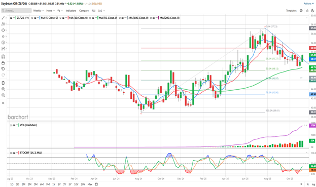 The weekly chart displayed above gives a life-of-contract view of the January contract. You might see the Fibonacci retracements, drawn from the contract lows in the 2nd week of August 2024 to the contract highs in the last week of July 2025. The 50% level (48.12) hasn’t been tested, but the 38% level (50.27) has been tested for the past 8 weeks, including this one. I know it’s only Tuesday and we still have 3 trading sessions and a delayed WASDE/Crop Production report on Friday to get through before this weekly bar ends. A weekly close above the blue trendline is bullish, in my opinion. Conversely, if this market fails to hold gains throughout the week and closes back below it, could be considered bearish. The 5-and 10-week moving averages are still in a bearish configuration, but the market is now trading above them and I would view those averages as potential support levels now. The 5-week is furthest (blue, 50.51) and the 10-week offers the nearest support (red, 50.73) to my eye. The 50-week (green, 48.75) almost got tested last week, but the low of last week stayed 10 ticks above it. And the 50-week is still inclined higher, indicating a market that is trending higher to me. Weekly Stochcastics (bottom sub-graph) are correcting out of an oversold condition that’s been maintained for the past 8 weeks. Two weeks of bullish prices does not change a trend, but if this continues, it’s quite possible that new contract highs are in the cards. You might notice that it took just 7 weeks to reach those highs when this market was rallying from 50.00 in the second week of June. I don’t think it will do it that quickly this time around, but we’ll have to stay tuned to find out. All-in-all, the weekly chart seems to show a market that gapped aggressively higher in June, set new highs late in July and has since retraced and found support. At least that’s what I see. What do you take away from it?