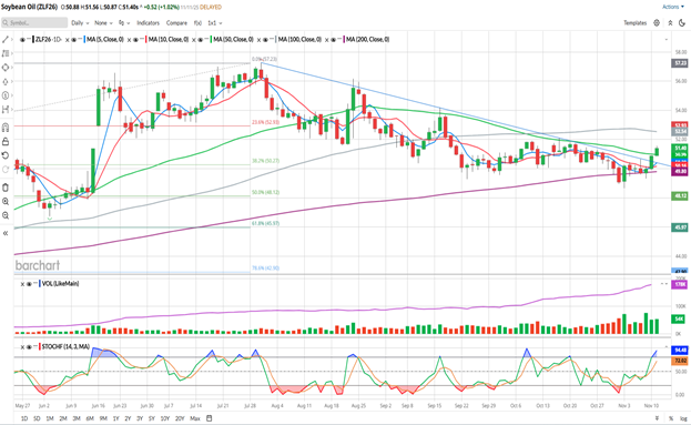 According to Barchart’s Seasonal Data, which can be viewed here, Soybean Oil tends to trade a little lower in November and December. However, rallies are not uncommon and we’re already up 2.42 this month. Keep in mind that while seasonals can be a guide, they are not hard and fast rules that the market MUST follow. To my eye, we’ve seen divergence this year between the seasonals and the actuals.