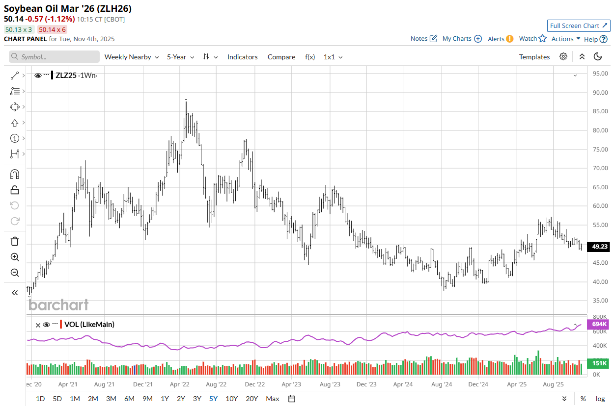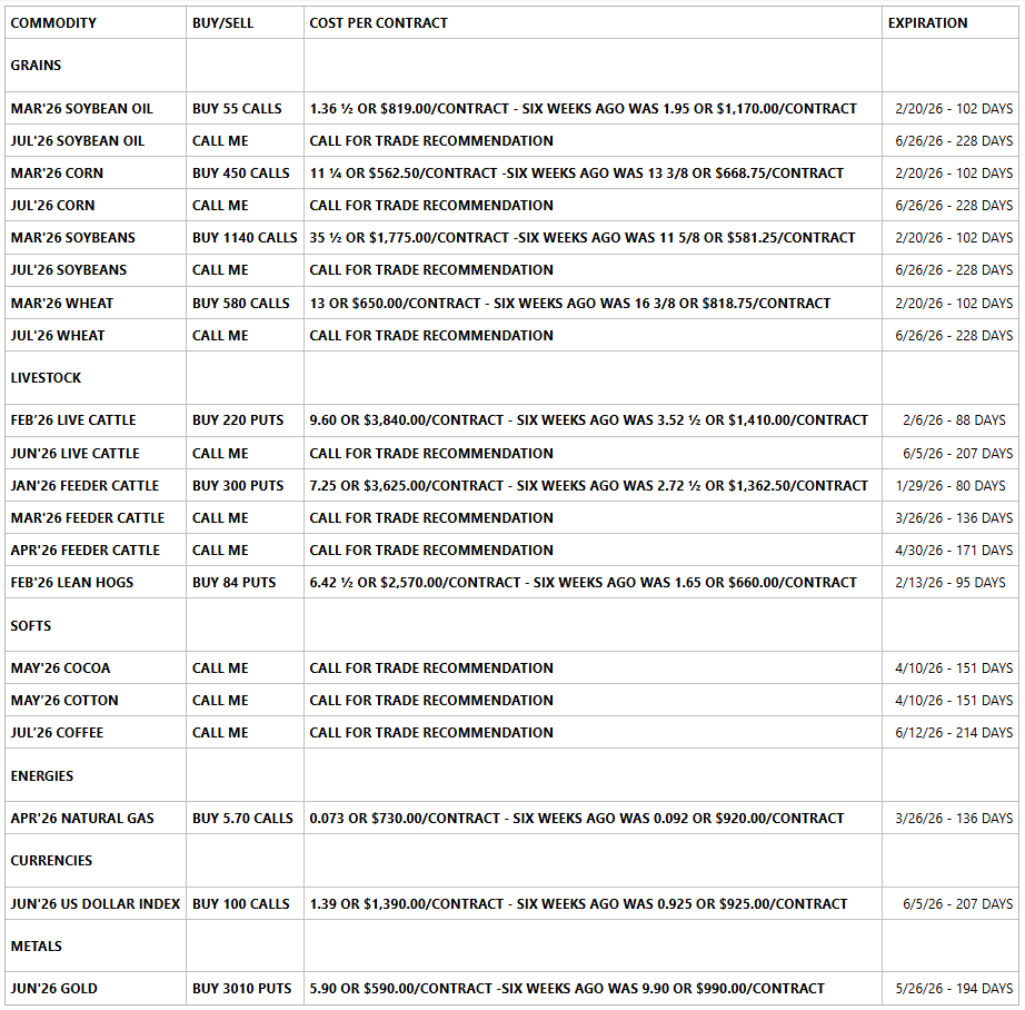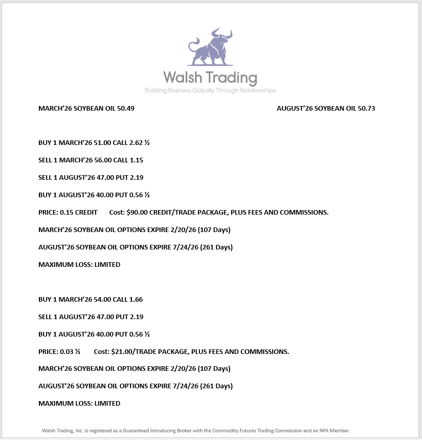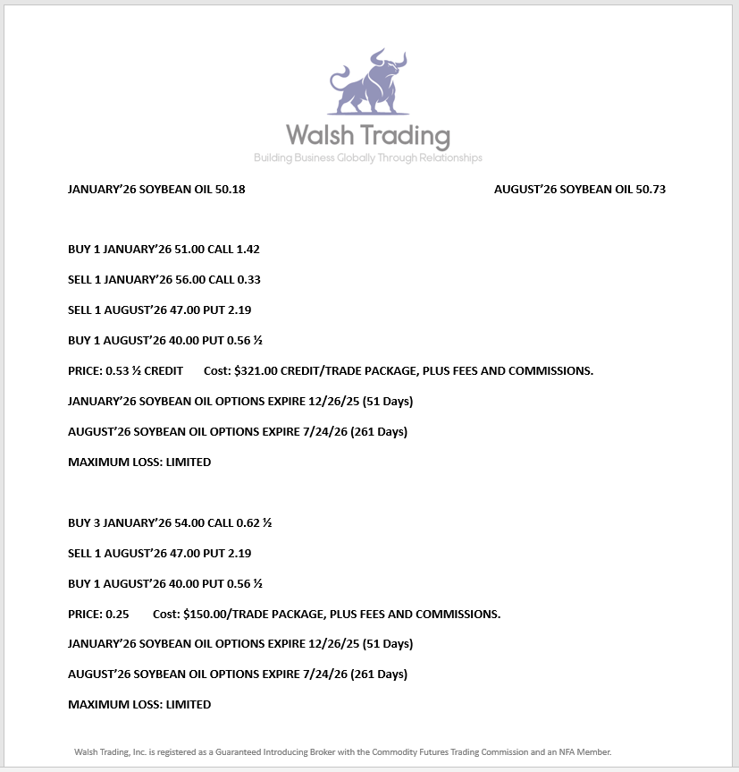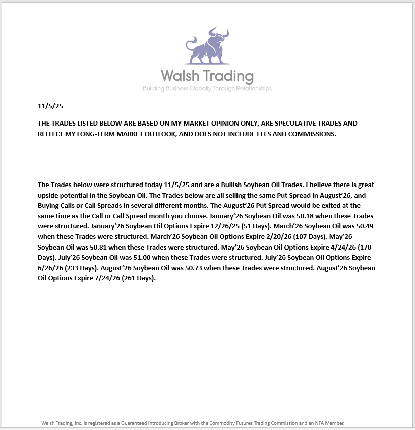 The Grain Markets were mixed today; without the standard large price swings we have seen recently. January’26 Soybeans settled a little lower today. January'26 Soybeans were 2 ¾ cents lower today and settled at 1127 ¼. Today's high was 1130 ¼ and the 1-month and contract high are 1137. Today's low was 1119 ¼ and the 1-month low is 1018 ½. Since 10/10 January'26 Soybeans are 1.04 higher or more than 10%. December'25 Corn closed in the green today. December'25 Corn was 2 ¼ cents higher today and settled at 432. Today's high was 432 ¾ and the 1-month high is 437. Today's low was 428 ½ and the 1-month low is 409 ¼. Since 10/10 December'25 Corn is 19 cents higher or more than 4 ½%. The Wheat stayed positive as well today. March'26 Wheat was 1 ¼ cents higher today and settled at 551 ¾. Today's high was 554 and the 1-month high is 568. Today's low was 546 and the 1-month and contract low is 508 ½. Since 10/10 March'26 Wheat is 36 ½ cents higher or just over 7%. If the US Government reopens by the end of the week, there could be lots of new market information available. The WASDE Report was changed from this past Monday to this Friday 11/14/25. Grain inspections were released earlier this week, and they looked very strong for the Corn, Beans, and Wheat. With several Trade Deals secured with multiple countries over the last couple of weeks, we could see very strong demand numbers. I would be interested in hearing any yield updates as well. It would be great to see one more run higher in all the grains to close out the week. This is what I wrote about the Soybean Oil contract on 10/31/25. "The Soybean Oil actually has a story, and I feel it can start rallying next week. Today I bought the March'26 Soybean Oil Futures and Sold the July'26 Futures. I purchased the March'26 0.55 under the July'26. Customers are also long the Soybean Oil in several different Option Trades. Here is why I like the Soybean Oil. The Palm Oil supply is getting tight, and export controls seem very possibly next year. The Indonesian Government must be worried about their supply, as they seized land in Palm Oil producing regions and place them under State Owned Control. At the same time, the production and export supplies of Sunflower Oil are expected to decline, as the price continues to climb and make cheaper Soybean Oil more attractive. Sunflower Oil supplies are already tight, as production estimates have decreased throughout Europe, Russia, and Ukraine, which will limit the amount of Sunflower seed crushing, again making the cheaper Soybean Oil more attractive. Biofuel percentages are set to increase in Brazil, Indonesia, and Malaysia, and I would not be surprised if the Biofuel blend rates were raised domestically as well. Argentia has already sold most of their Soybeans to China, so their crushing will be limited as well. It all points to what could be a very dramatic price increase in the Soybean Oil Market". I have continued to buy Soybean Oil Future Spreads and Options Spreads as the market continues to rally. March'26 Soybean Oil settled at 51.95 and I feel we can see it trade much higher. The August'26 Soybean Oil Settled at 52.24 and I feel we can see that contract month trade into the 60.00's. I have been buying Natural Gas Futures and Option Spreads the last couple of days as well. There is still time to be involved in the Soybean Oil and Natural Gas Trades. Give me a call if you are interested. There are Natural Gas, Soybean Oil, and Feeder Cattle Trades below. Have a great night.
