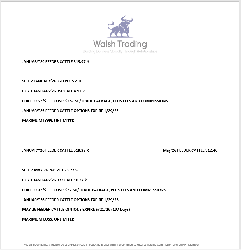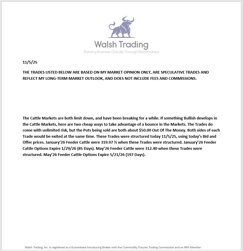 The Livestock Markets were mixed today, with the Fats dropping more than a dollar. December'25 Live Cattle were 1.35 lower today and settled at 227.20. Today's high was 229.60 and the 1-month and contract high is 248.30. Today's low was 226.27 ½ and the 1-month low is 218.07 ½. Since 10/10 December'25 Live Cattle are 15.32 ½ lower or more than 6%. The January'26 Feeders managed to stay positive today. The January'26 Feeder Cattle were 32 ½ cents higher today and settled at 329.15. Today's high was 333.47 ½ and the 1-month and contract high is 380.20. Today's low was 328.87 ½ and the 1-month low is 311.40. Since 10/10 January'26 Feeder Cattle are 42.80 lower or 11 ½%. The Hogs resumed trading lower again today. December'25 Lean Hogs were 42 ½ cents lower today and settled 82.35. Today's high was 83.25 and the 1-month high is 85.50. Today's low was 82.30 and the 1-month low is 78.80. Since 10/10 December'25 Lean Hogs are 1.67 ½ lower or almost 2%. Fear of the Government Shutdown ending, and unknow potential policy changes kept the Cattle Markets in check today. The US Southern Border will reopen eventually, tariffs could change at any time, and the government could be open again on Friday, just before the WASDE Report. The US Supreme Court has not yet ruled on the legality of the tariffs, but even if the court rules against his Presidential authority, nothing would be changed for months, but the thought of it changing could break the futures market further as well. President Trump has shifted gears as well, now focused on the packers, as that is where any scrutiny should be. The December'25 Fats traded up to 229.60 but were unable to trade at the 100-Day moving average of 229.84 ½ and fell apart from there. The January'26 Feeders tried to stage a large two-day rally, after yesterday's limit up move, but faded lower after running out of juice several dollars higher. The January'26 Feeders stayed positive but had a small 32 ½ cent gain for the day. If the January'26 Feeders can close above the 100-Day moving average of 336.10 ½, it could attract new buying in the Cattle Markets. My short-term market view is friendly in the Cattle Markets, but long-term does not look good, unless things in Washington are clearly stated, and not changed, but I would not hold my breath for any of that to happen. I did buy the January'26 Feeder Cattle 335/350 Call spread early yesterday, but I will get out of it before the government reopens. There are Trades below in the Feeder Cattle, Soybean Oil, and Natural Gas markets. If you have any questions, give me a call. Yesterday's Walsh Gamma Trader is shown below as well. I would like a chance to work with you, and I am always available, have a great night.