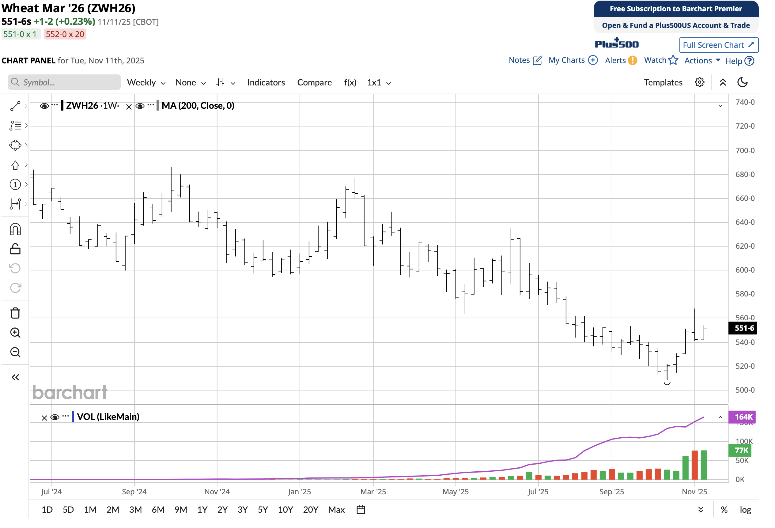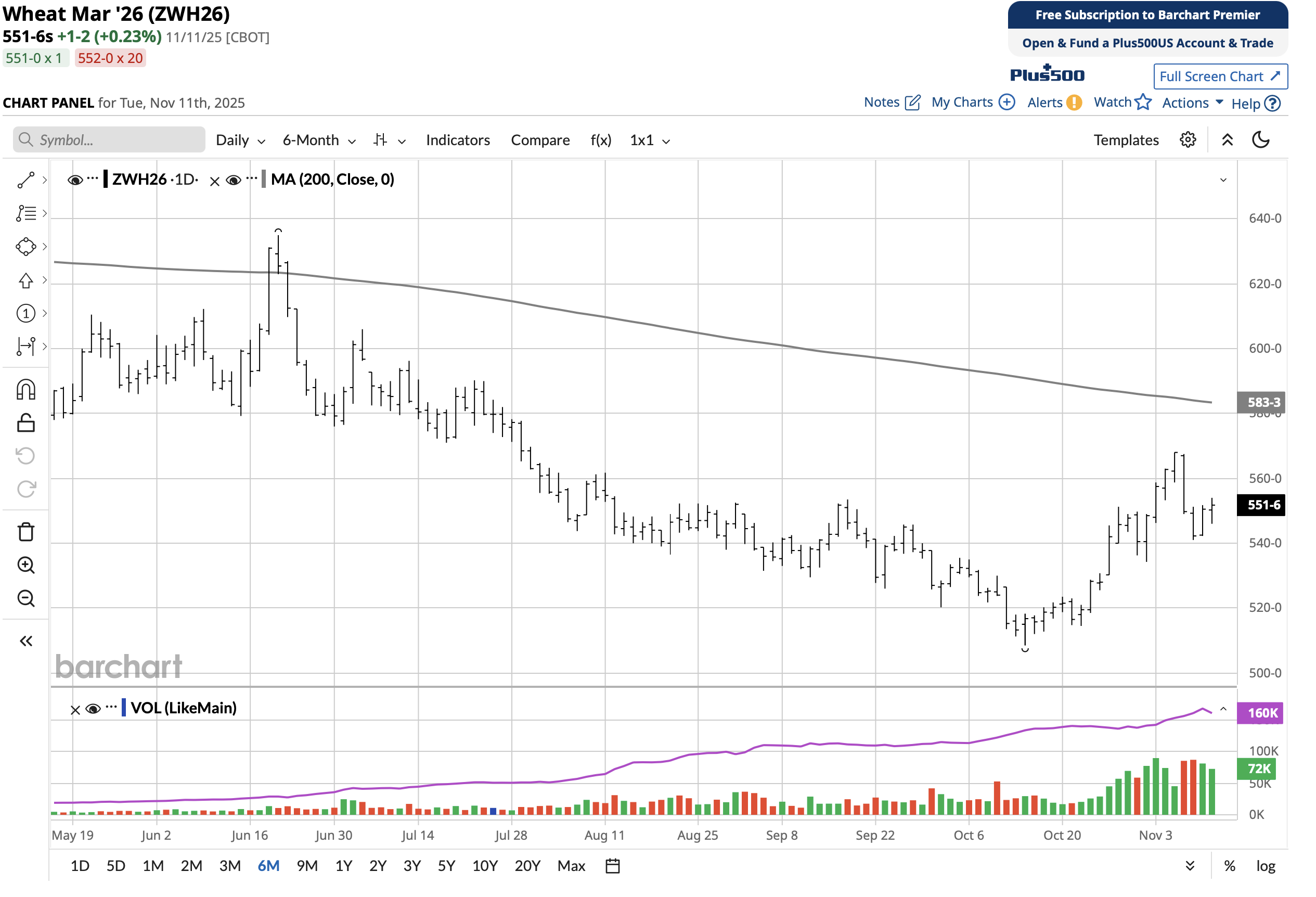 A futures strategy is to buy one March 2026 wheat at 541.0, good until cancelled (GTC). That was the low on November 7. Have a sell stop at 531.0, GTC.