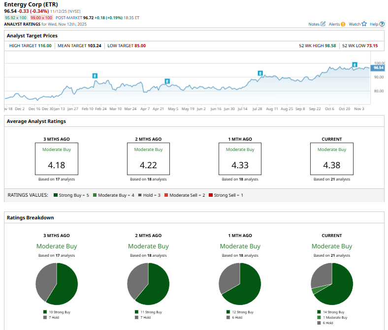 On Oct. 25, J.P. Morgan analyst Jeremy Tonet reiterated a “Buy” rating on Entergy and maintained a $113 price target on the stock.