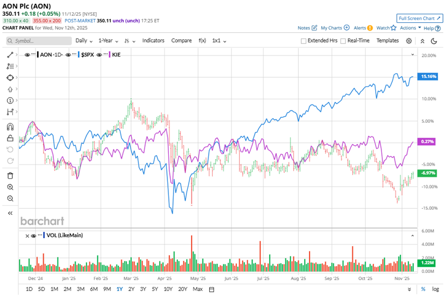 Shares of this leading professional services firm have underperformed the broader market over the past year. AON has declined 8.7% over this time frame, while the broader S&P 500 Index ($SPX) has rallied nearly 14.5%. In 2025, AON stock is down 2.5%, compared to the SPX’s 16.5% rise on a YTD basis.