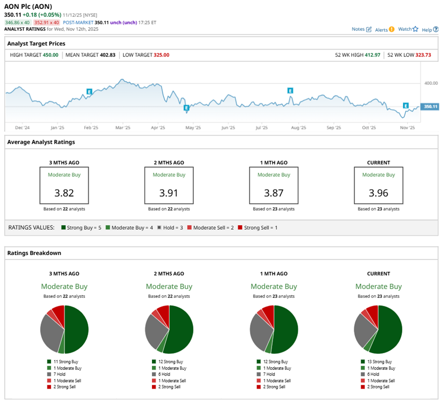 On Nov. 10, UBS analyst Brian Meredith kept a “Neutral” rating on AON and lowered the price target to $390, implying a potential upside of 11.4% from current levels.