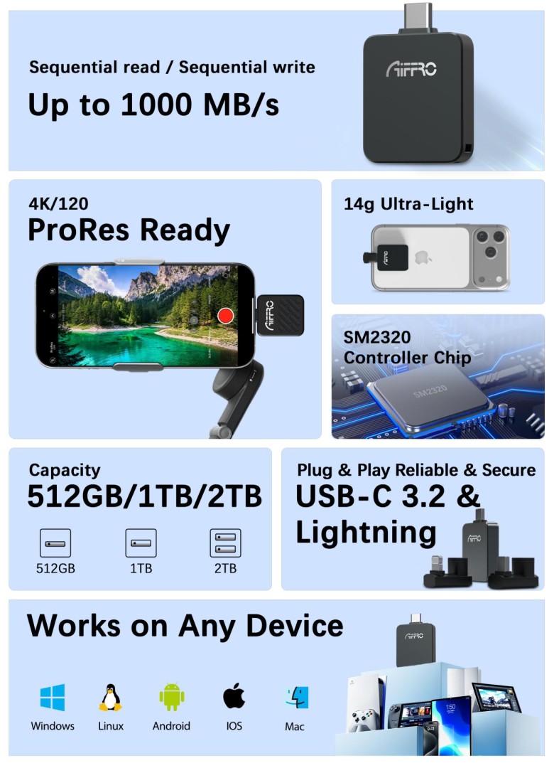 The Aiffro product team stated, “The P20 represents our vision of what modern portable storage should be: powerful, versatile, and easy to carry. We designed it to support workflows that move between phones, tablets, and computers, so users can record, transfer, and edit with confidence wherever they are.”