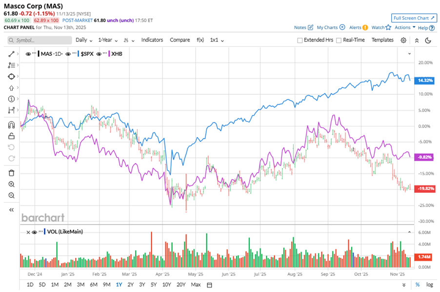 Narrowing the focus, MAS’ underperformance is also apparent compared to the SPDR S&P Homebuilders ETF (XHB). The exchange-traded fund has declined about 10.6% over the past year. Moreover, the ETF’s marginal dip on a YTD basis outshines the stock’s double-digit losses over the same time frame.