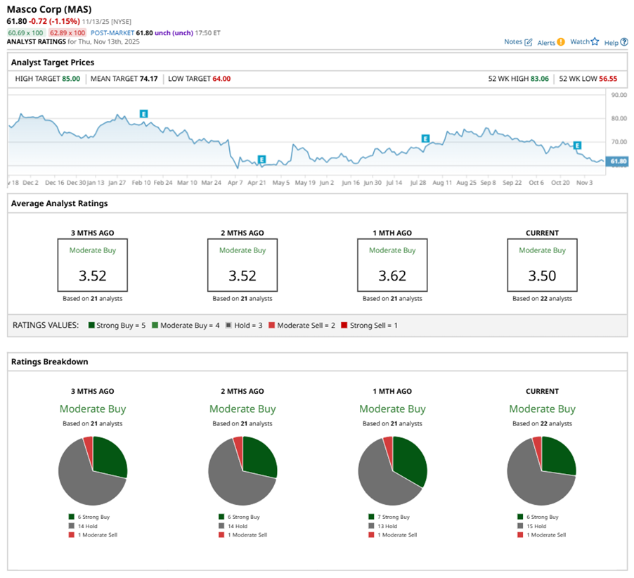 Among the 22 analysts covering MAS stock, the consensus is a “Moderate Buy.” That’s based on six “Strong Buy” ratings, 15 “Holds,” and one “Moderate Sell.”