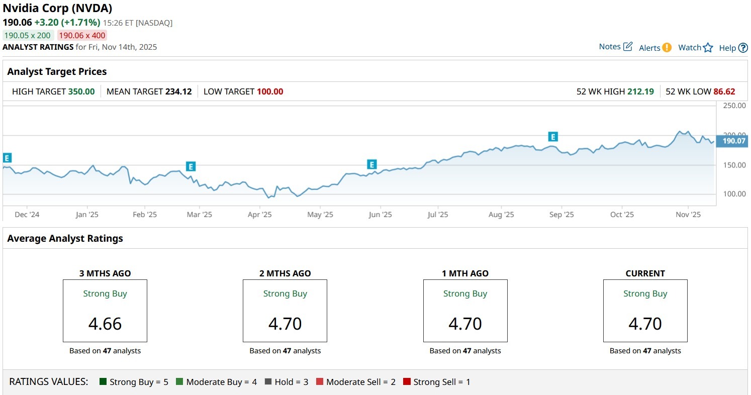 The consensus rating on NVDA stock currently sits at strong buy, with the mean target of an even higher $234 signaling potential for another 27% rally from here.