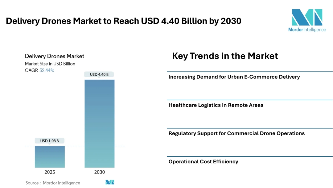 To view the original version on ABNewswire visit: Delivery Drones Market to Reach USD 4.40 Billion by 2030, Driven by Expanding Urban E-Commerce and Healthcare Logistics - Mordor Intelligence