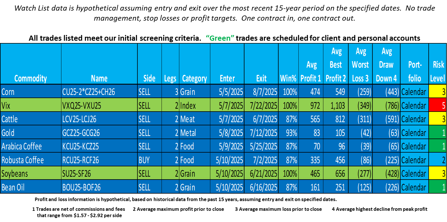 The SpreadEdge Newsletter includes a “Watch List” of trades that meet our strict screening criteria. Included in the Watch List are the markets, commodity symbols, entry and exit dates, win %, average profit, average drawdown, best profit, worst loss, and risk level (using a 1-5 scale). All information is hypothetical and is based on the most recent 15 years of historical data.