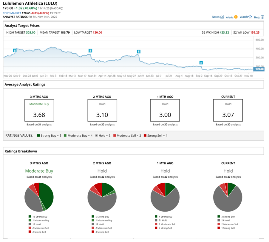 On Oct. 27, Matthew Boss from JPMorgan Chase & Co. (JPM) maintained a “Hold” rating on LULU with a price target of $191, implying a potential upside of 11.9% from current levels.