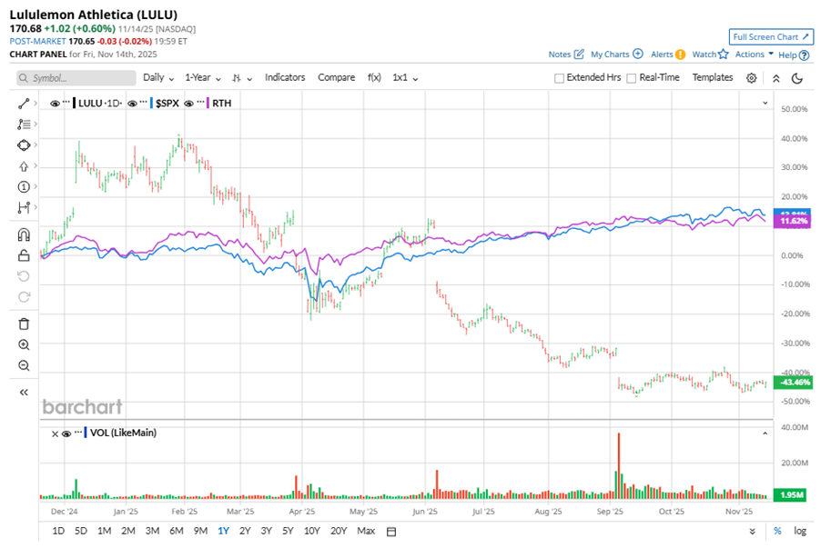 Shares of this athletic apparel giant have significantly underperformed the broader market over the past year. LULU has declined 48.3% over this time frame, while the broader S&P 500 Index ($SPX) has rallied nearly 13.2%. In 2025, LULU stock is down 55.4%, compared to the SPX’s 14.5% rise on a YTD basis.