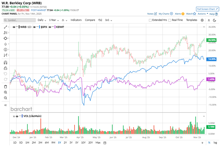 Shares of this leading property casualty insurance holding company have outperformed the broader market over the past year. WRB has gained 29.1% over this time frame, while the broader S&P 500 Index ($SPX) has rallied nearly 13.2%. In 2025, WRB stock is up 31.6%, surpassing SPX’s 14.5% rise on a YTD basis.