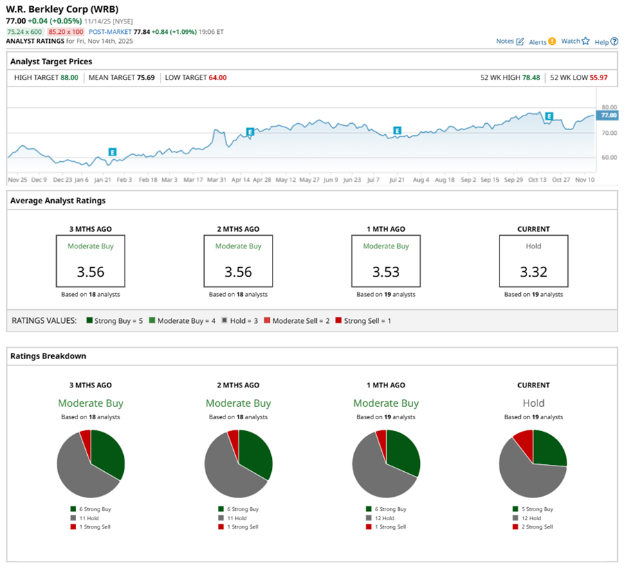 On Nov. 11, Meyer Shields from KBW maintained a “Hold” rating on WRB with a price target of $73.