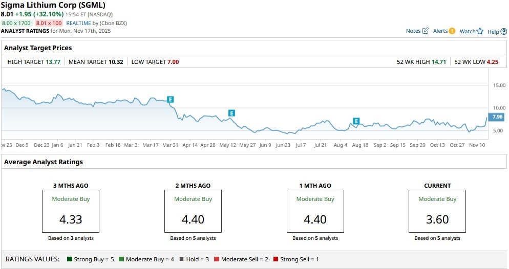 The consensus rating on SGML stock currently sits at “Moderate Buy,” with price targets going as high as $13.77, indicating potential upside of roughly 25% from here.