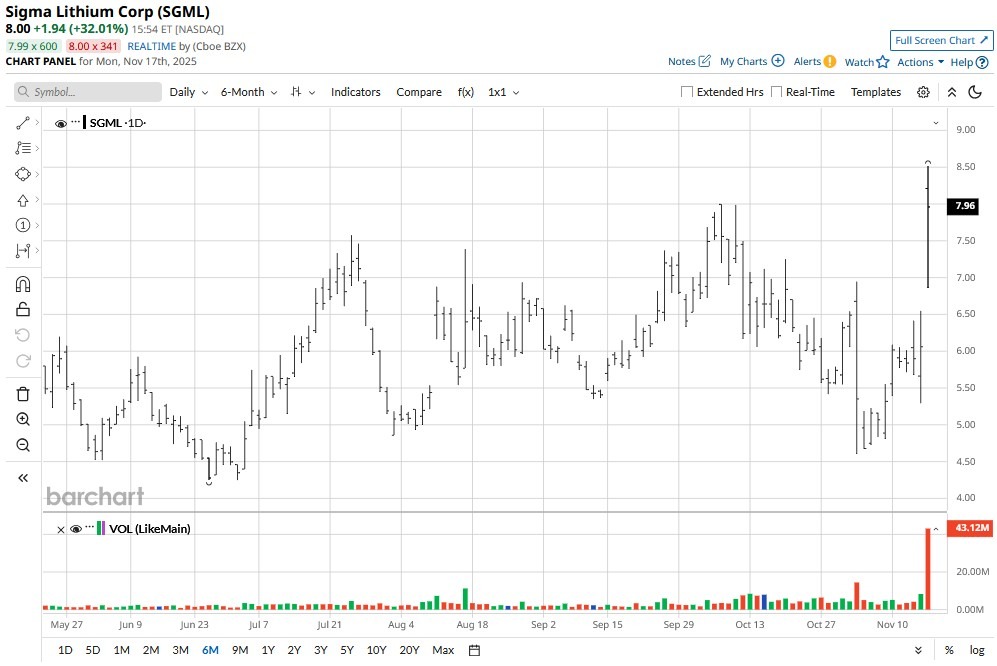 Sigma Lithium (SGML) shares closed 32% higher on Nov. 17 after Li Liangbin, the chairman of Ganfeng Lithium Group, forecast a 30%-40% increase in global lithium (LMZ25) demand for 2026.