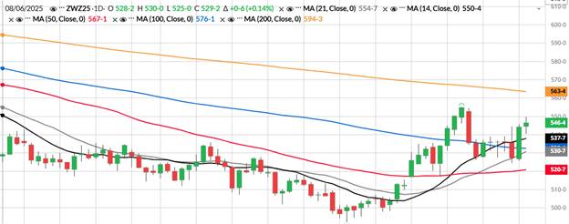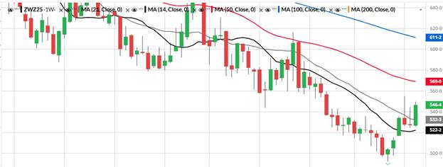Looking at the weekly charts for December wheat we have support at 524 ½ followed by 522 ¼ which is the 14-period moving average. For resistance we have 555 followed by the 50-period moving average of 569. (see chart below).