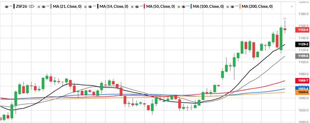 January soybeans closed the day lower after taking out yesterday's high of 1160 ¼ and trading up to 1169 ½ before fading lower. USDA also reported a daily sale of 792,000 MT to China for the 2025-26 marketing year. Looking at the daily charts for January beans we have resistance at 1169 ½ which was today’s high, and first support is coming in at the 14-day moving average which is 1129 ½ then followed by yesterday’s low of 1114 ¼. (see chart below)