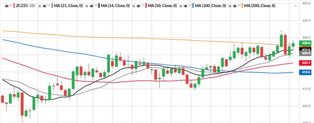 Looking at the weekly charts for December corn we have resistance at 442 ¾ followed by 451 ¾ which is the 100-period moving average. For support I am also using 426 ¼ and 421 ¼ which is the 21-period moving average. (see chart below).