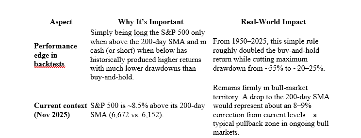 The 200-day SMA is not magic, but because so many large players watch it and trade it, it has become one of the most important price levels on the chart. For the S&P 500 right now (November 2025), staying above ≈6,150–6,200 keeps the long-term bull market intact. A sustained break below would be a major warning signal that the character of the market has changed.
