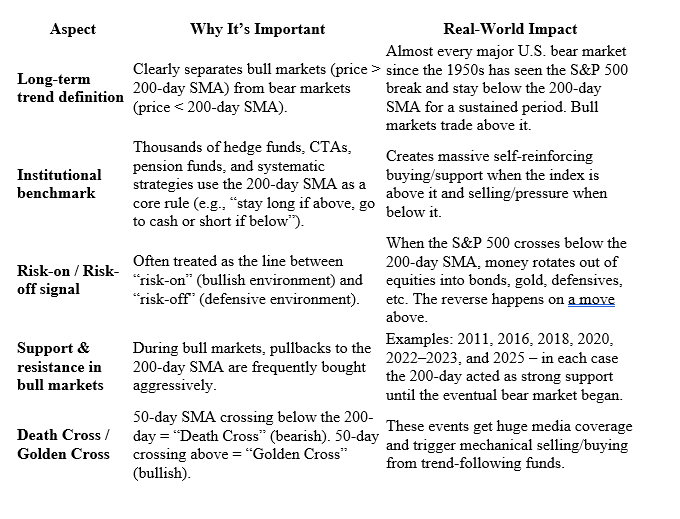 The 200-day Simple Moving Average (200-day SMA) is one of the most widely watched technical indicators in global financial markets, especially for the S&P 500. Its importance comes from a combination of institutional usage, psychological reinforcement, and historical track record. Here’s why it matters so much: