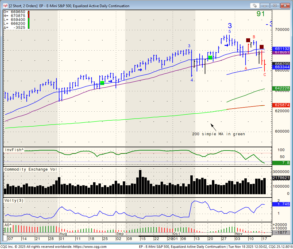 Mini SP daily chart with the 200 simple moving average below for review - pay attention to the recent sell signal we got on the daily chart in the form of a maroon square