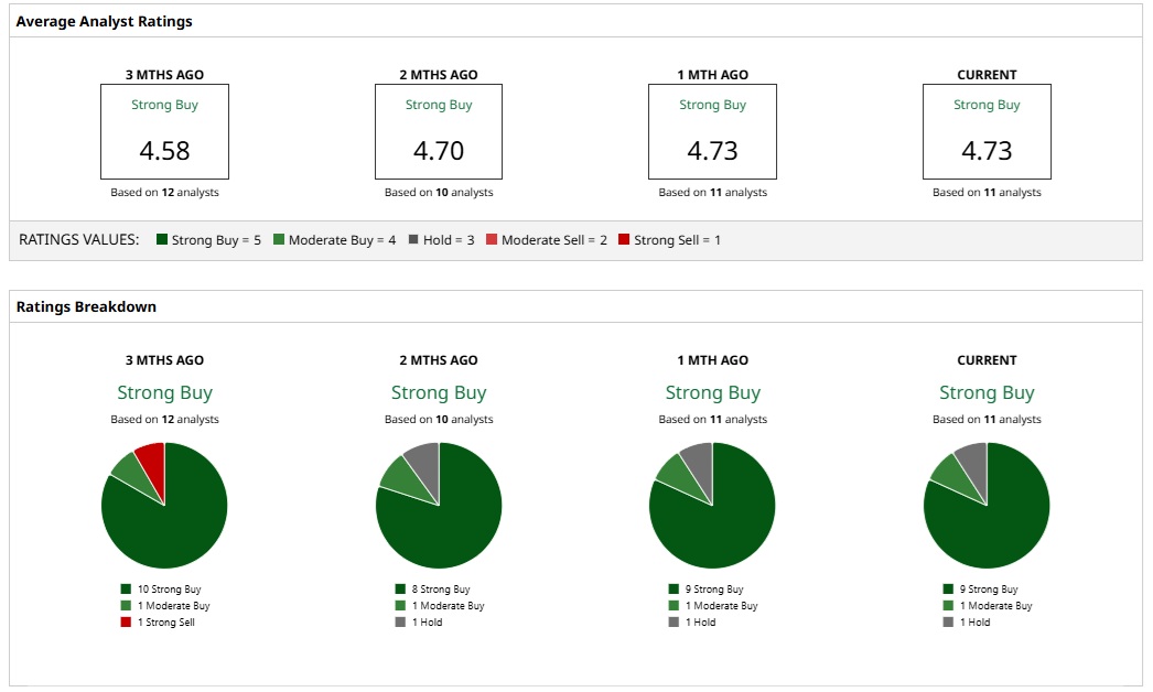 An overwhelming majority of nine analysts have assigned a “Strong Buy” rating, with a “Moderate Buy” and “Hold” rating assigned by one analyst each.