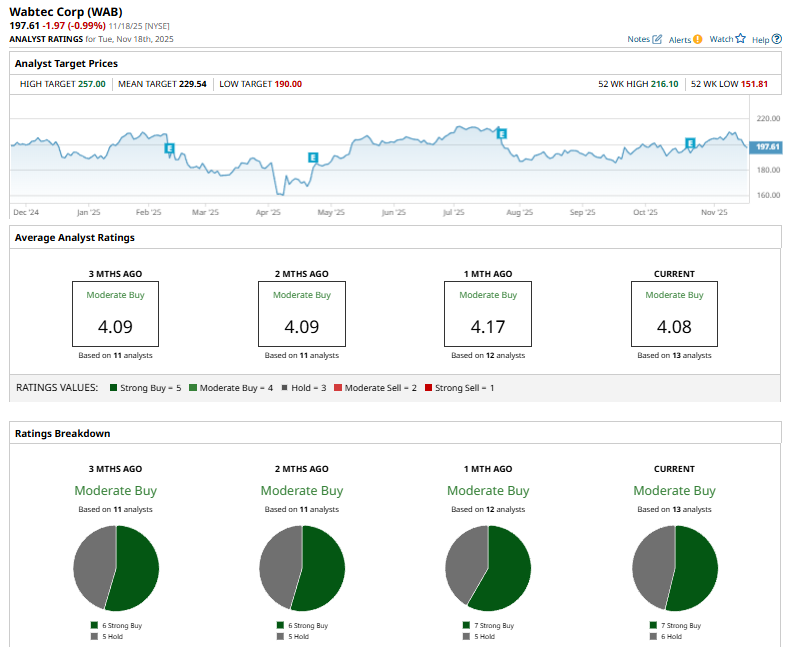 WAB has a consensus “Moderate Buy” rating overall. Of the 13 analysts covering the stock, opinions include seven “Strong Buys” and six “Holds.”