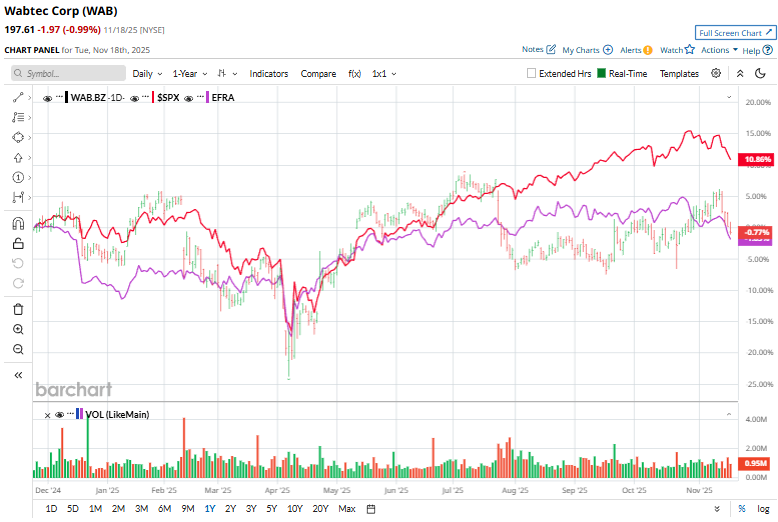 WAB’s stock prices have grown 1.1% over the past 52 weeks, lagging the S&P 500 Index’s ($SPX) 12.3% gains over the past year. In 2025, WAB has surged 4.2%, trailing the $SPX’s 12.5% rise.
