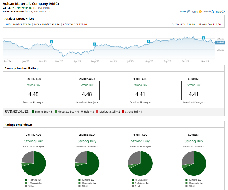 Among the 22 analysts covering VMC stock, the consensus is a “Strong Buy.” That’s based on 15 “Strong Buy” ratings, one “Moderate Buy,” and six “Holds.”