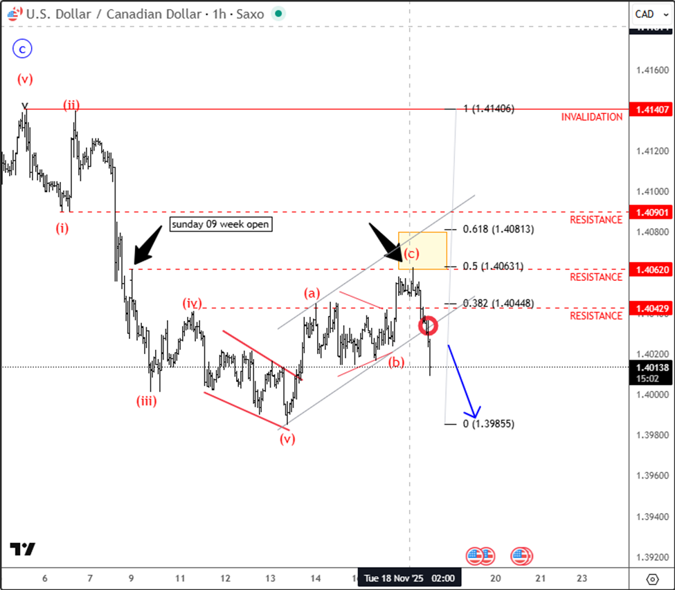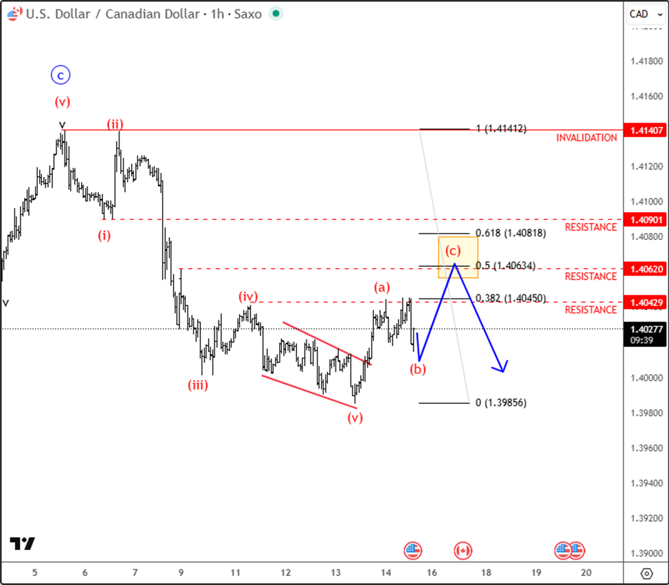 “USDCAD is nicely recovering after we yesterday spotted an intraday wedge pattern within wave (v) of an impulse,. So as expected, it can be now making a three-wave abc corrective rally, where wave (c) can retest 1.4060 - 1.4080 zone before a continuation lower”