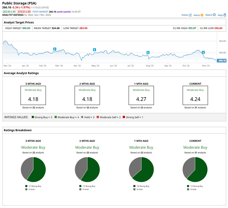 On Nov. 18, UBS analyst Michael Goldsmith kept a “Neutral” rating on PSA and lowered the price target to $293, implying a potential upside of 10.1% from current levels.