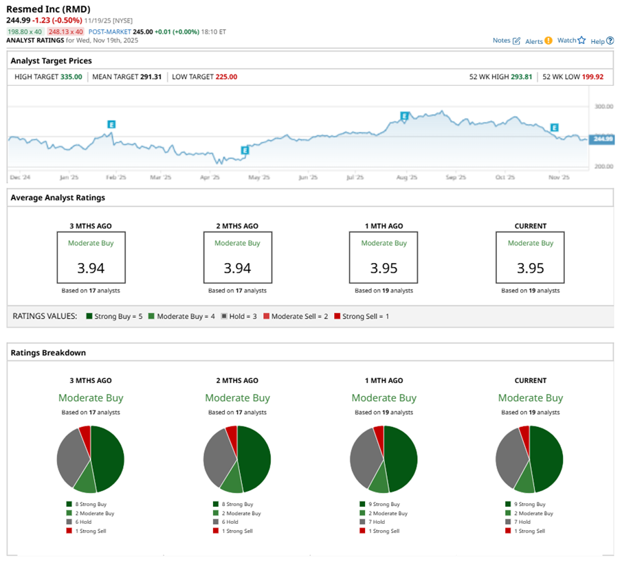 Among the 19 analysts covering RMD stock, the consensus is a “Moderate Buy.” That’s based on nine “Strong Buy” ratings, two “Moderate Buys,” seven “Holds,” and one “Strong Sell.”