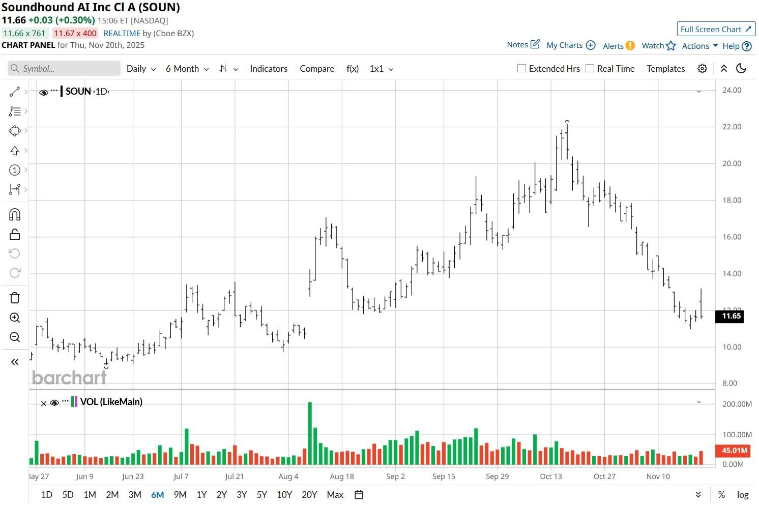 Following an initial spike, SoundHound stock reversed much of its intraday gains on Nov. 20, and is now trading nearly 50% below its year-to-date high set in mid-October.