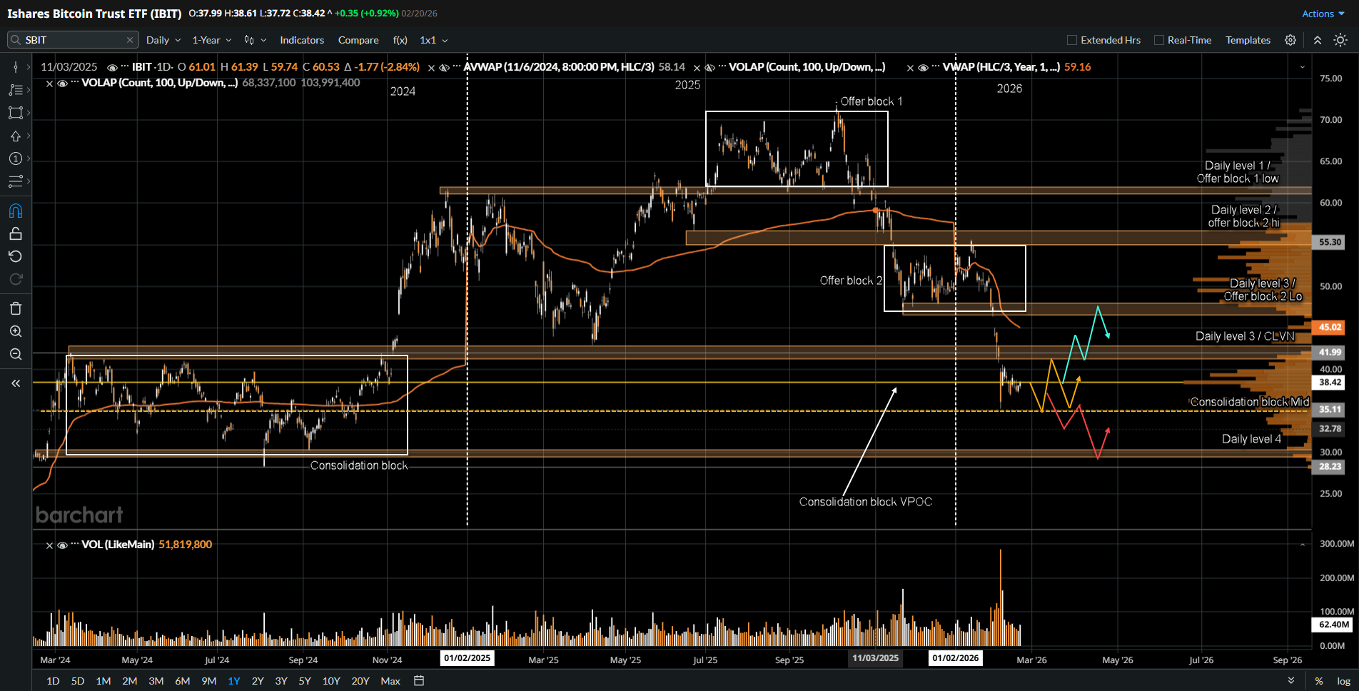 Key levels to watch are 42 on the upside and 35, which represents consolidation block mid and translates to approximately 61,638 on Bitcoin.