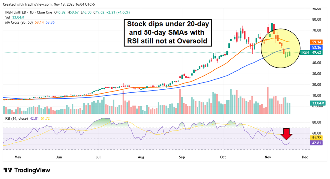 Cipher Mining reported record revenue in its Q3 2025 earnings release but remains unprofitable, and management expects more supply chain delays into 2027. And much like IREN, the chart is showing downward price pressure, with the 20-day SMA dipping below the 50-day SMA and the RSI trending lower (but far from Oversold territory).