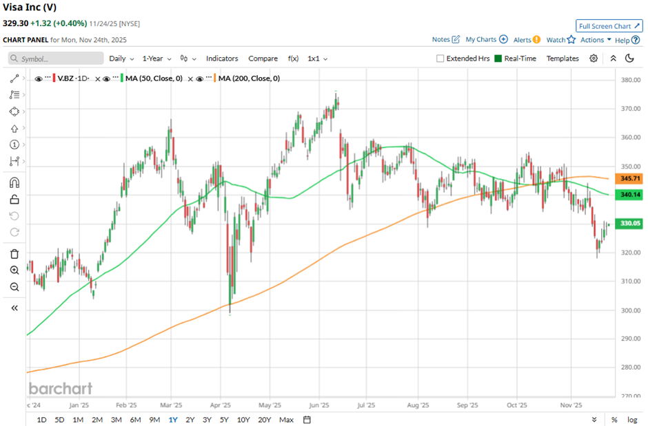 V stock has been trading below its 50-day and 200-day moving averages since late October.