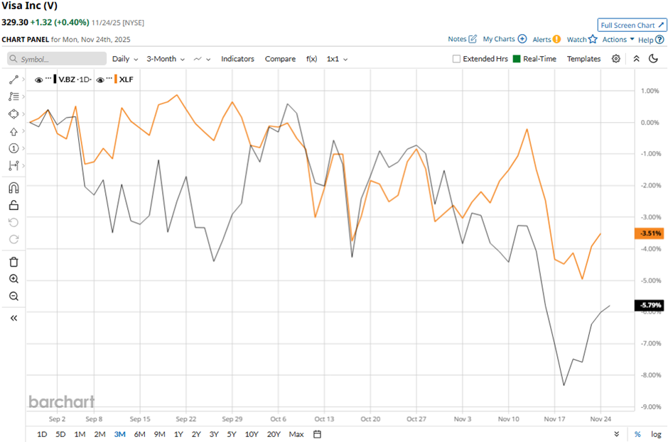 The San Francisco, California-based company has dipped 12.3% from its 52-week high of $375.51. Shares of Visa have decreased 5.9% over the past three months, lagging behind the Financial Select Sector SPDR Fund’s (XLF) 3.1% drop over the same time frame.