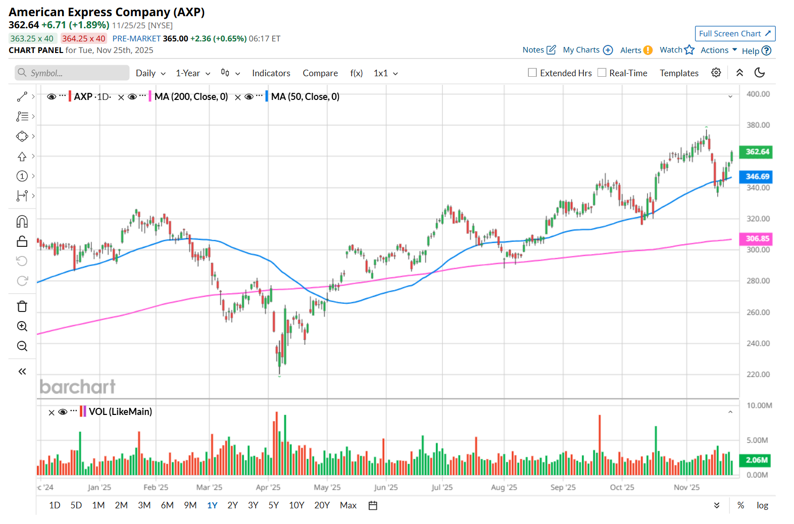 To confirm its bullish trend, AXP has been trading above its 200-day and 50-day moving averages since early May, with slight fluctuations.