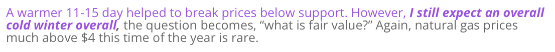 While the market could be over-bought and we explain some of the reasons why natural gas prices may have a hard time making new highs for the moment, weather models may not be cold enough for most of December. Some models are breaking down the upcoming cold US outlook by mid-December, but that may only be temporary. Below we discuss the conflicting signals in the market.