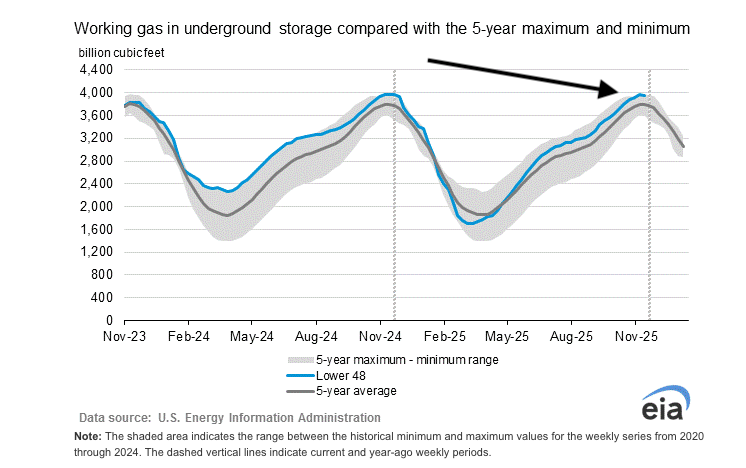 November 2025 saw daily US production hit a new record at 109.7 billion cubic feet per day, with a fresh single-day high just shy of 111.2 bcfd. Storage levels are also overflowing, sitting 4.6% above the five-year average at nearly 3,950 billion cubic feet.
