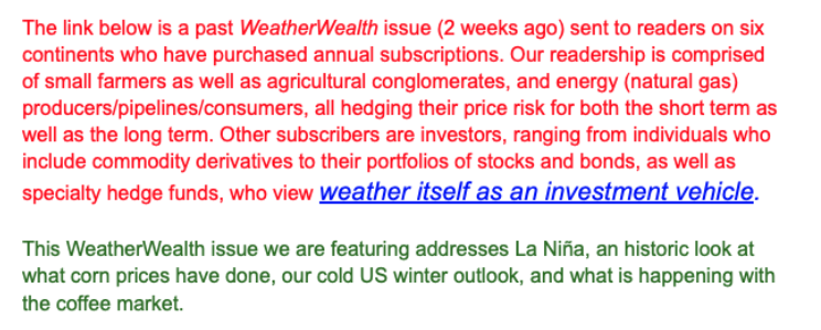 “So how does one trade this market? Futures, options, or ETFs? That is where our WeatherWealth newsletter comes in by helping traders and producers around the world.”