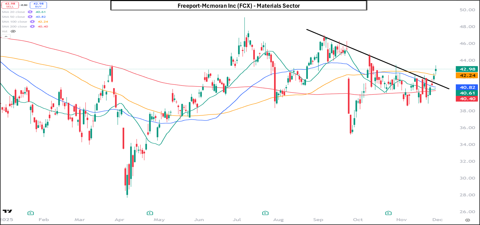Freeport-McMoRan broke above the downward trendline this week. FCX is now sitting comfortably above all 4 moving average.