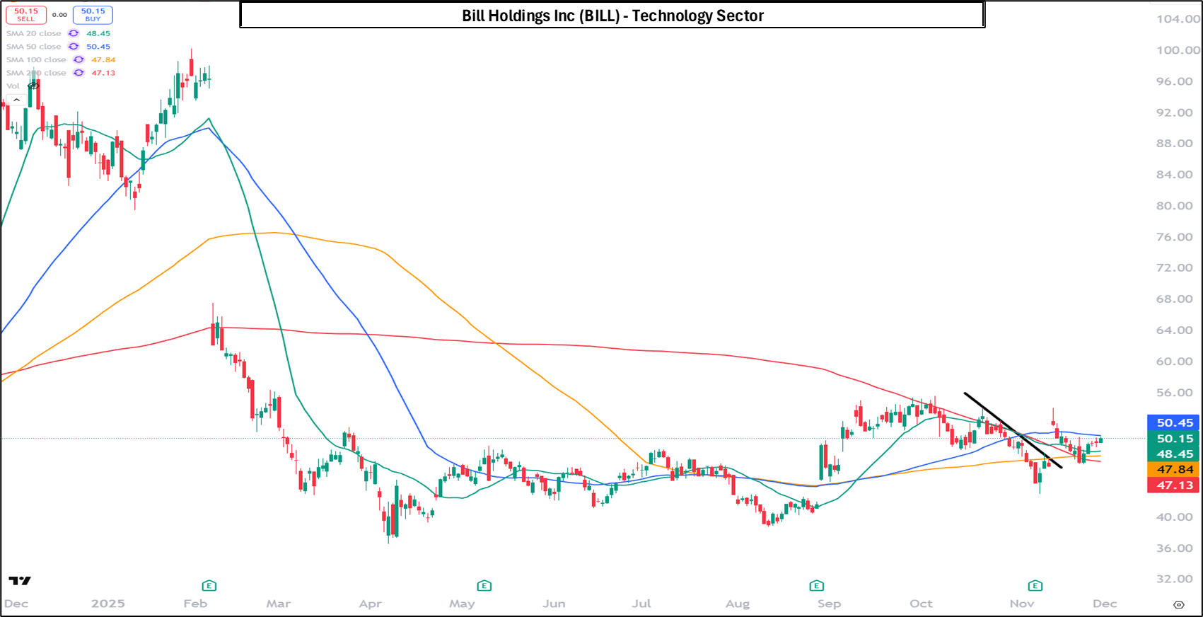 BILL Holdings reported positive earnings earlier this month a gapped above the downward trendline. Since then, BILL has settled back slightly and now has strong support from 3 moving averages.