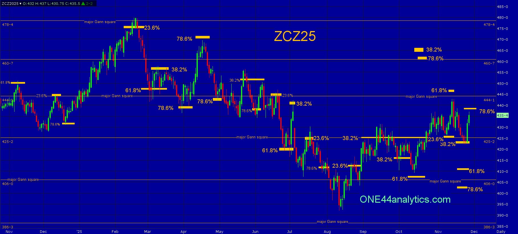 So far it has had a good rally from 423.50 (435.50 close), however we watch all the retracements on every move to see just how strong, or weak the market is regardless of the long term target, so we have to watch the 78.6% retracement back to the 11/14/25 high at 438.00 and this will be the swing point for the week.
