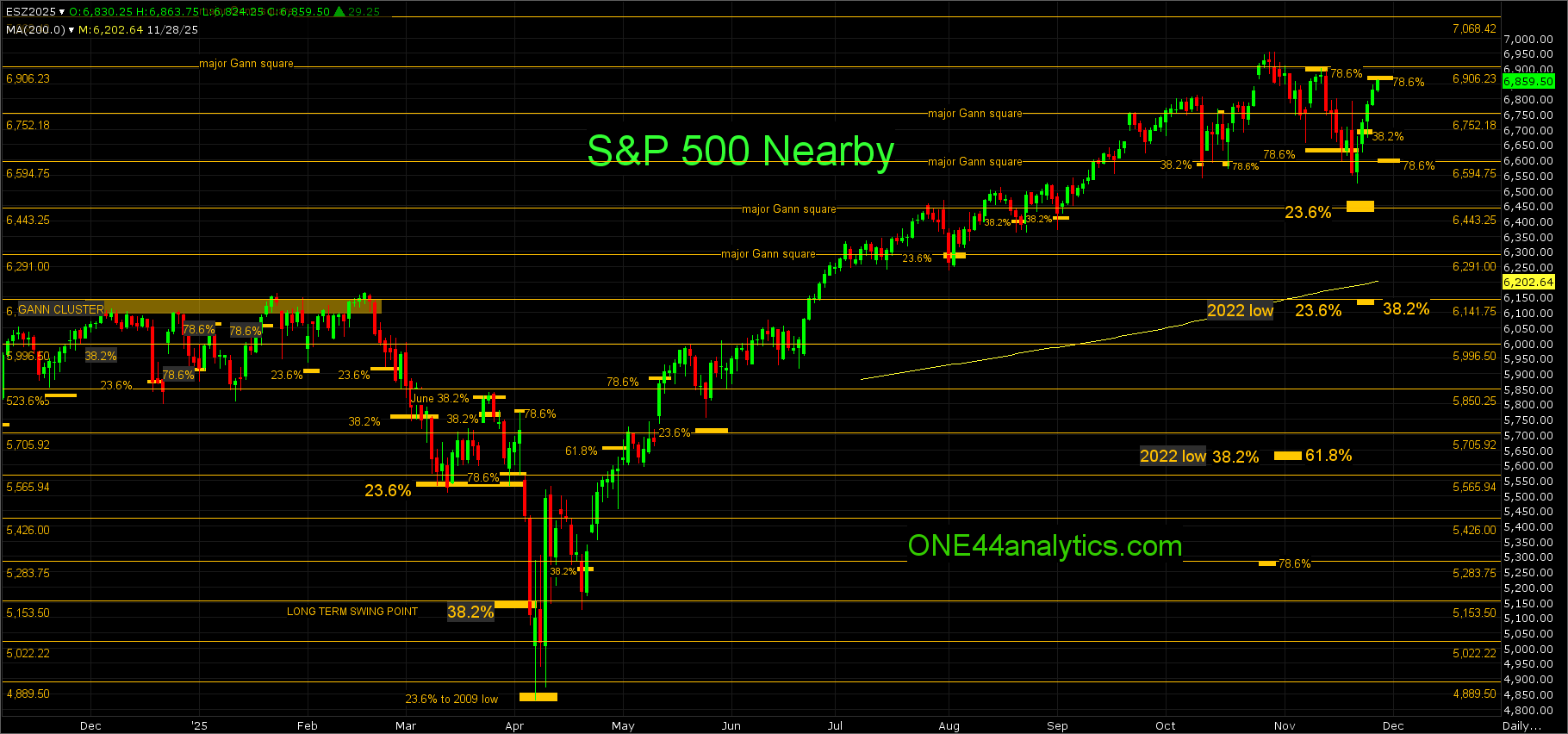 Below it, the short term target is 78.6% back to the 11/21/25 low at 6601.00 per the ONE44 78.6% rule, there is also the 6594.75 major Gann square for added support. The longer term target area is 23.6% back to the 4/7/25 low at 6466.00 and the 6443.25 major Gann square. The long term target and long term swing point is 38.2% of the same move at 6141.75 this also lines up exactly with 23.6% back to the 2022 low and a major Gann square to make it an even more important level. The 200 day average is now 6202.00. There is one major Gann square before then to look for support and then use as the swing point when it is closed below at 6290.75.
